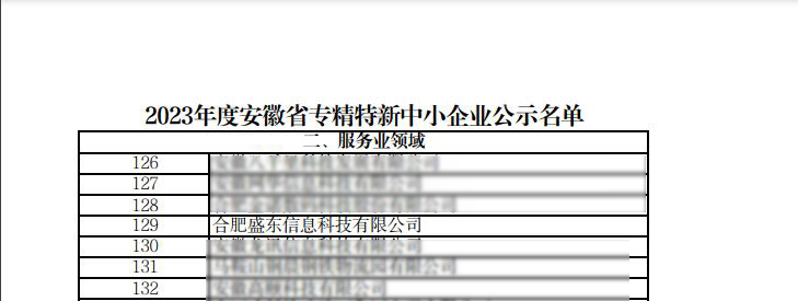 根据安徽省经济和信息化厅发布的《关于2023年度安徽省“专精特新”中小企业名单的公示》((皖经信中小企函〔2023〕65号)),合肥盛东信息科技有限公司被认定为2023年度安徽省“专精特新”中小企业。